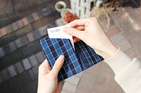 丸川商店オリジナルの二つ折り名刺ケースです。開くと両側に2つのポケットがあり、名刺を分けて収納できます。柔らかい芯を使用しているので、外側に折り曲げれば、名刺も出しやすくスマートです。両ポケットで名刺が約50枚、収納可能。名刺と一緒にICカードを入れても便利です。